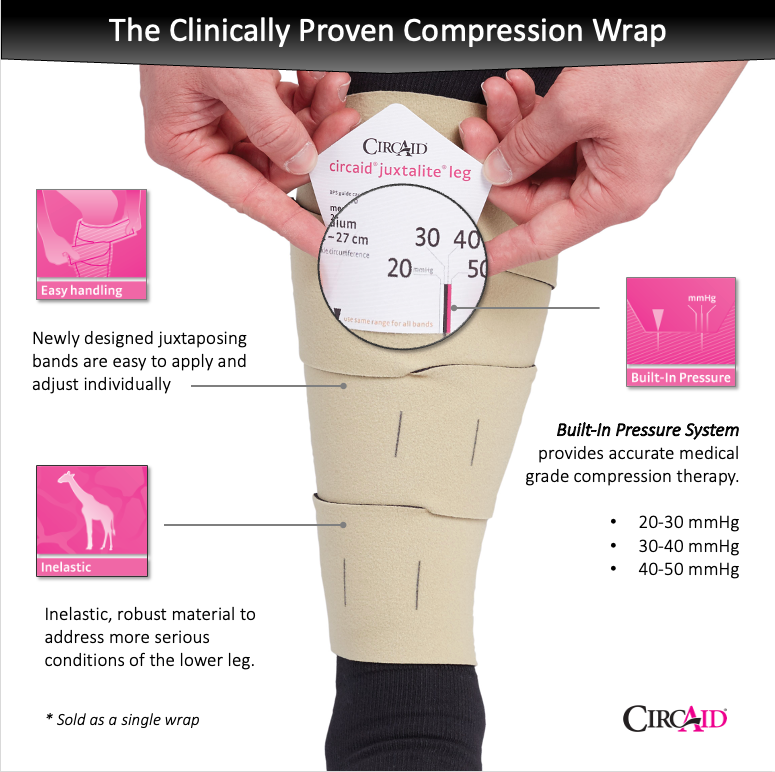 juxtalite wraps are built with inelastic compression to create higher working pressure for improved circulation. The juxtalite material acts like a wall when the muscles flex and push against it; further supporting the bodies natural function to circulate fluid in the lower leg. This effect, also known as muscle pump, offers greater edema control over elastic compression stockings.