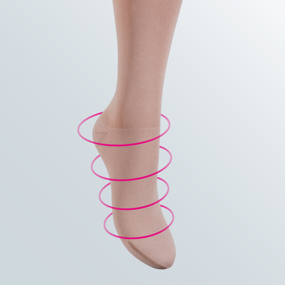 Elastic compression, the type of compression found in graduated compression stockings, uses elasticity to apply a set amount of pressure around the limb.