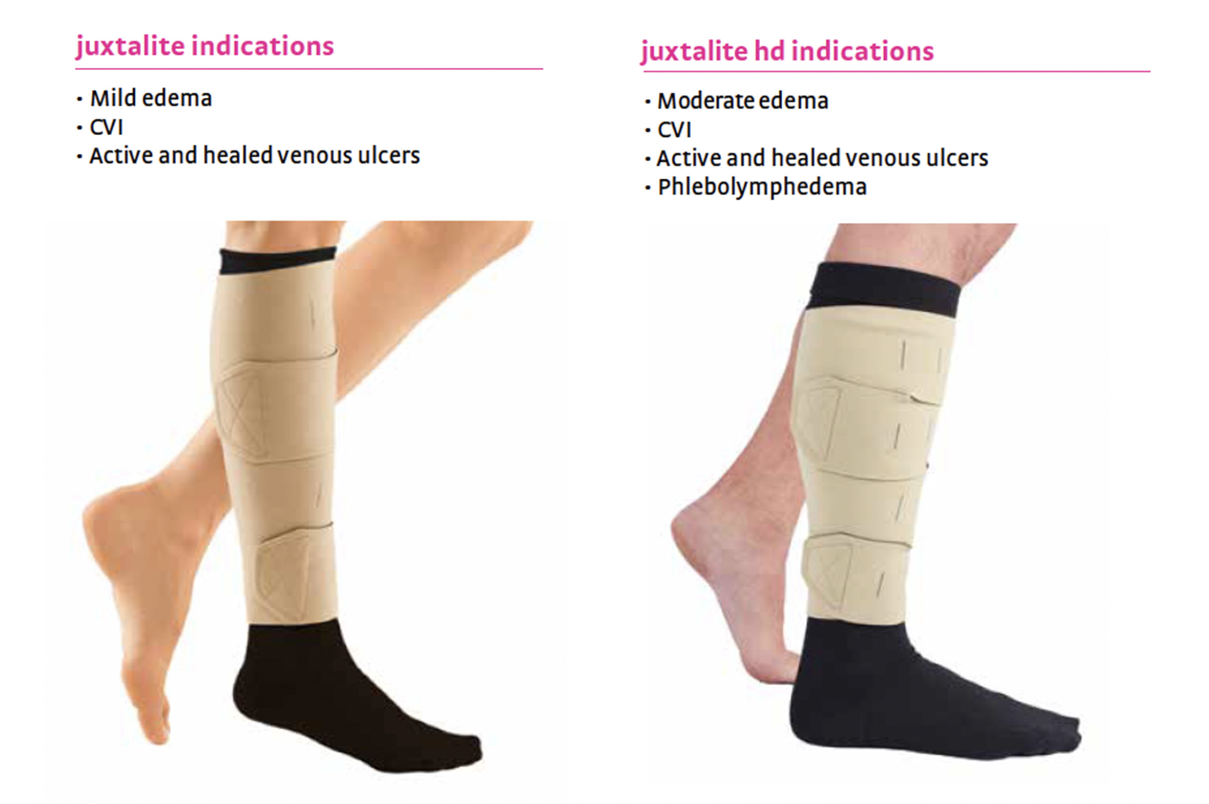 For this reason, inelastic wraps are a better choice for anyone suffering from more advanced stages of venous disease: venous leg ulcers, chronic venous insufficiency, phlebolymphedema (juxtalite HD).