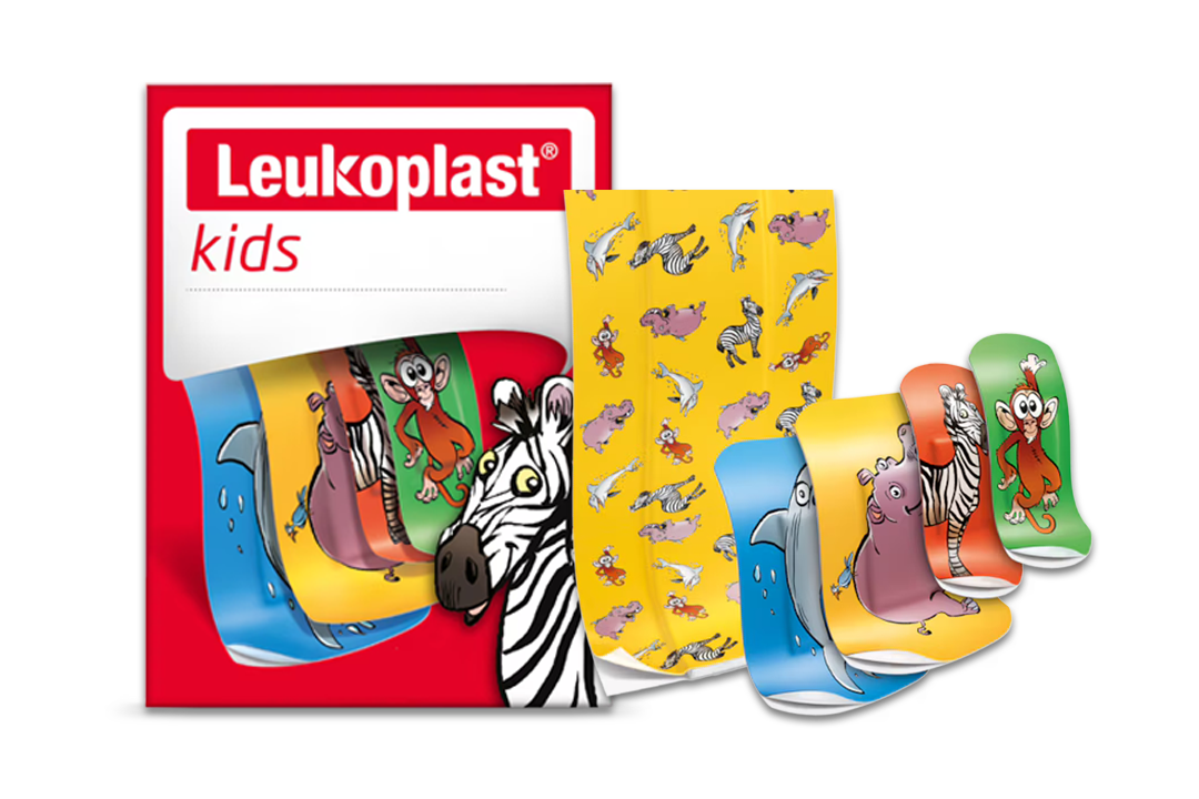Leukoplast kids plasters are water and dirt repellent and their printing is safe for kids: With their colorful animal motifs they make your children quickly forget small cuts and abrasions.