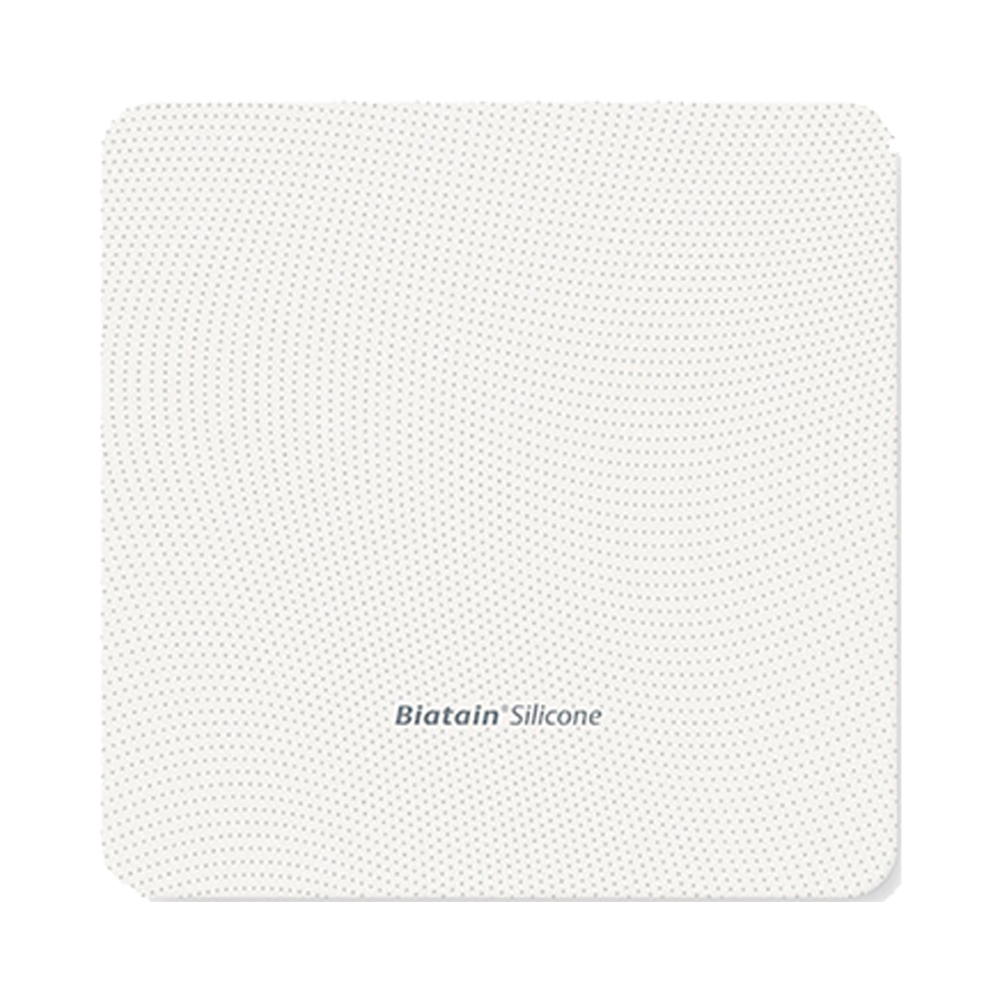 Biatain Silicone Non-Border is a soft and comfortable polyurethane foam dressing with a vapor-permeable top film that is bacteria- and waterproof, a gentle and perforated silicone adhesive, and turquoise protective films.