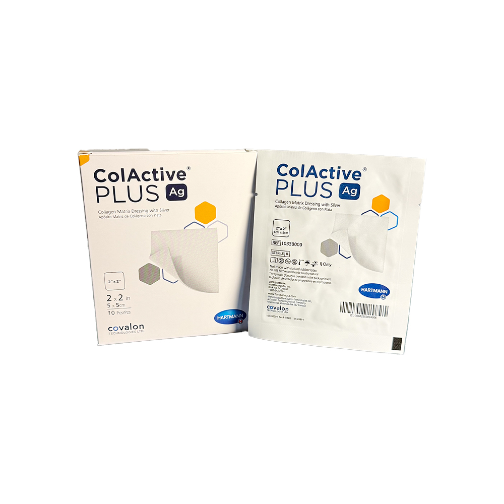 An advanced wound care dressing, ColActive® Plus Ag is formulated with a patented blend collagen, sodium alginate, carboxymethyl cellulose (CMC), ethylenediaminetetraacetic acid (EDTA) and silver chloride. Once it comes in contact with the wound fluid, this topically applied dressing transforms into a soft gel sheet that helps create a moist environment for healing, including the formation of granulation tissue and epithelialization.