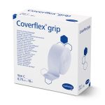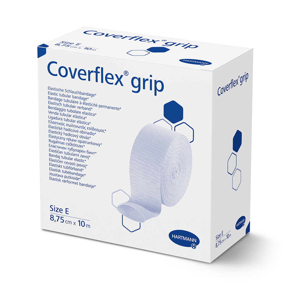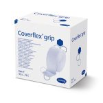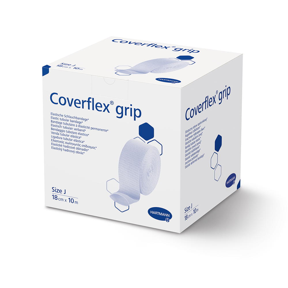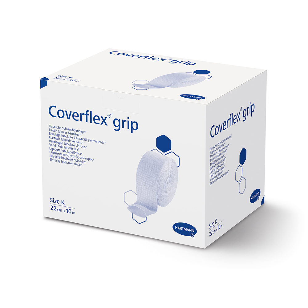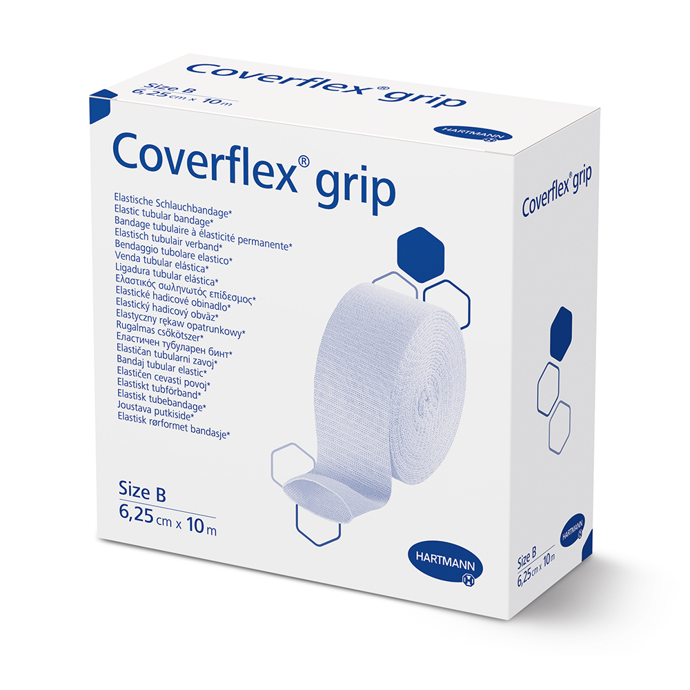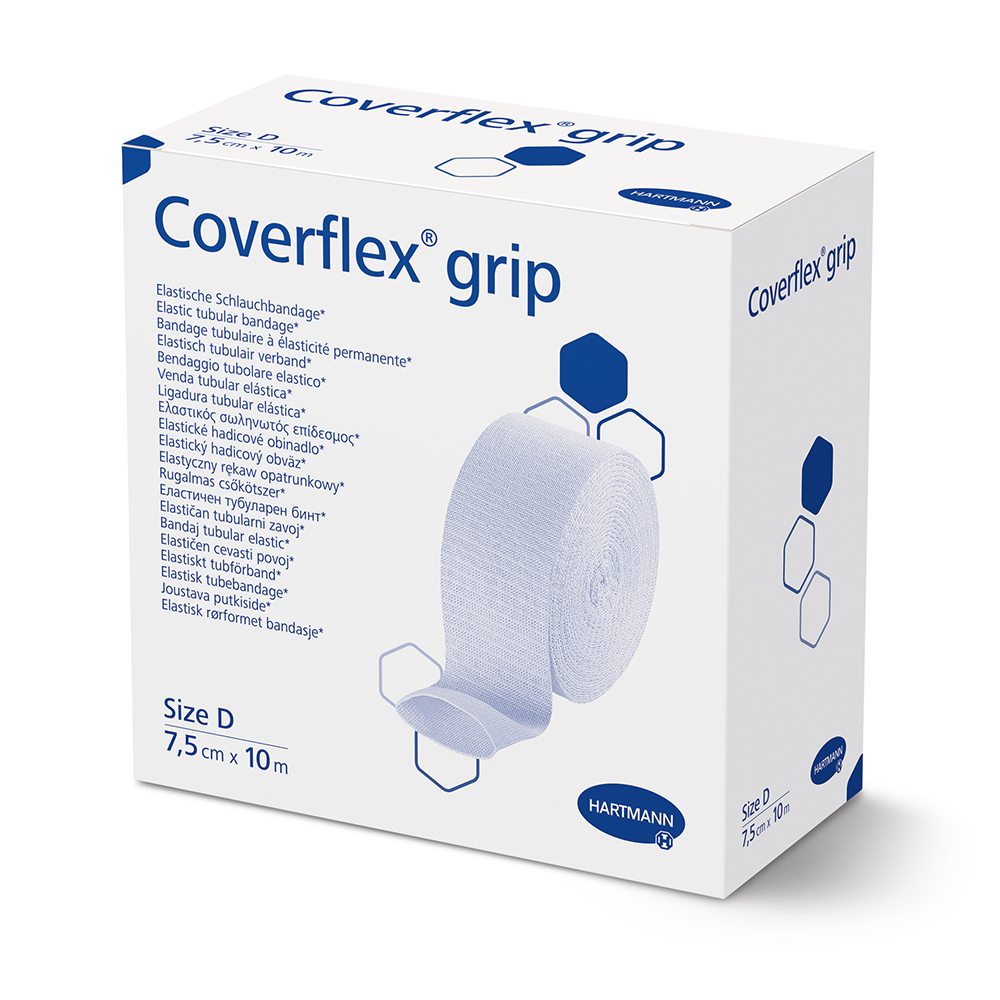 Coverflex® grip is an elastic tubular bandage, made from a cotton and synthetic blend, that does not contain natural rubber latex. It provides 360 degrees of uniform, consistent support and low level compression. The bandage is commonly used for secondary fixation, support for joints and ligaments, and to protect sensitive skin from adhesives or trauma.