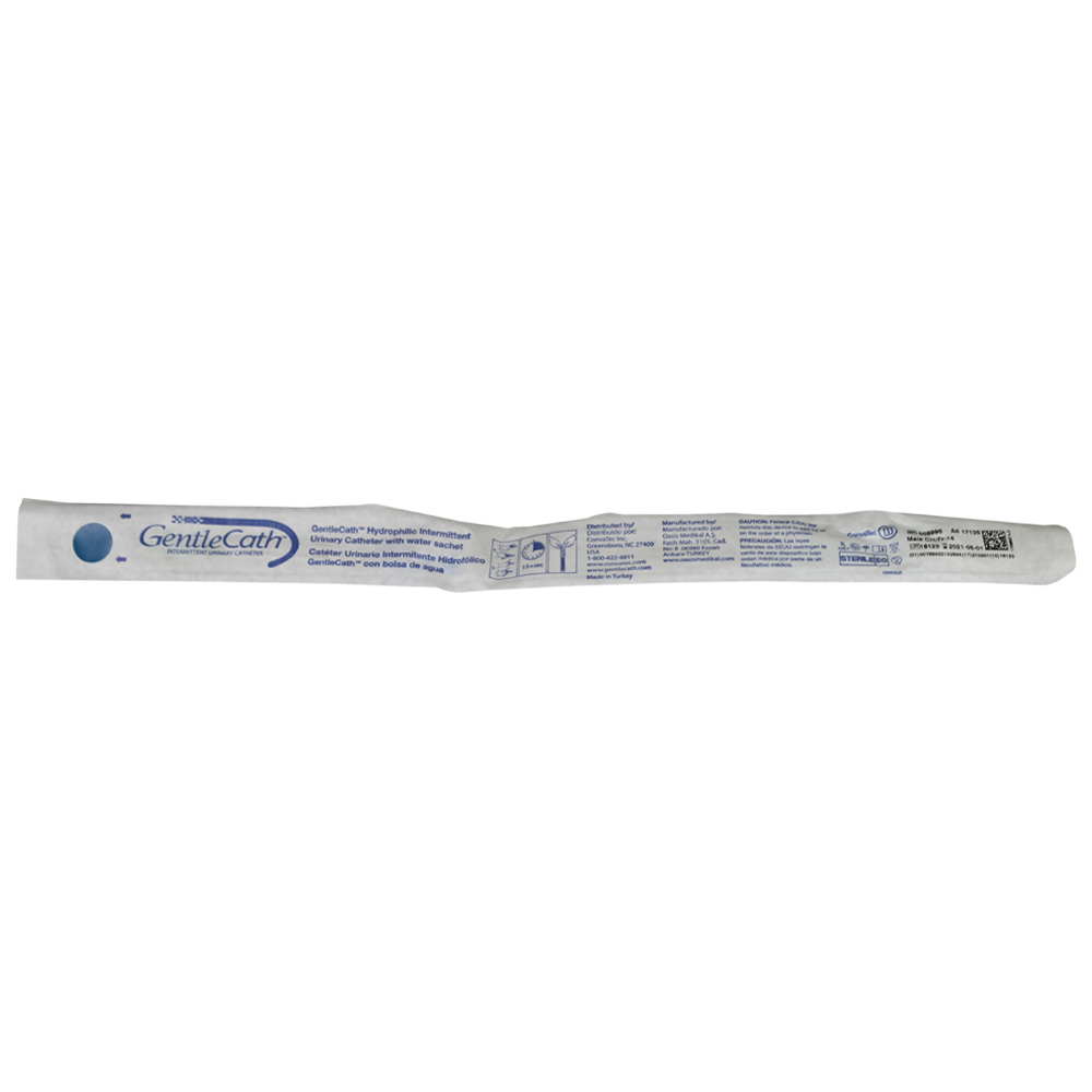 The GentleCath Hydrophilic coated catheter includes a sterile water sachet, wall attachment and unique no-touch handling strip to provide an intermittent catheter that allows the catheter to be prepared, used and discarded without the need for direct hand contact with the catheter.