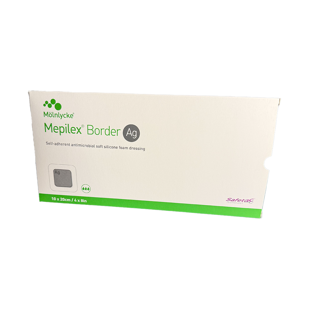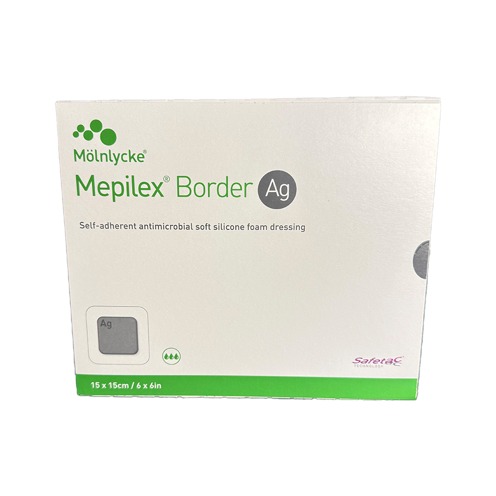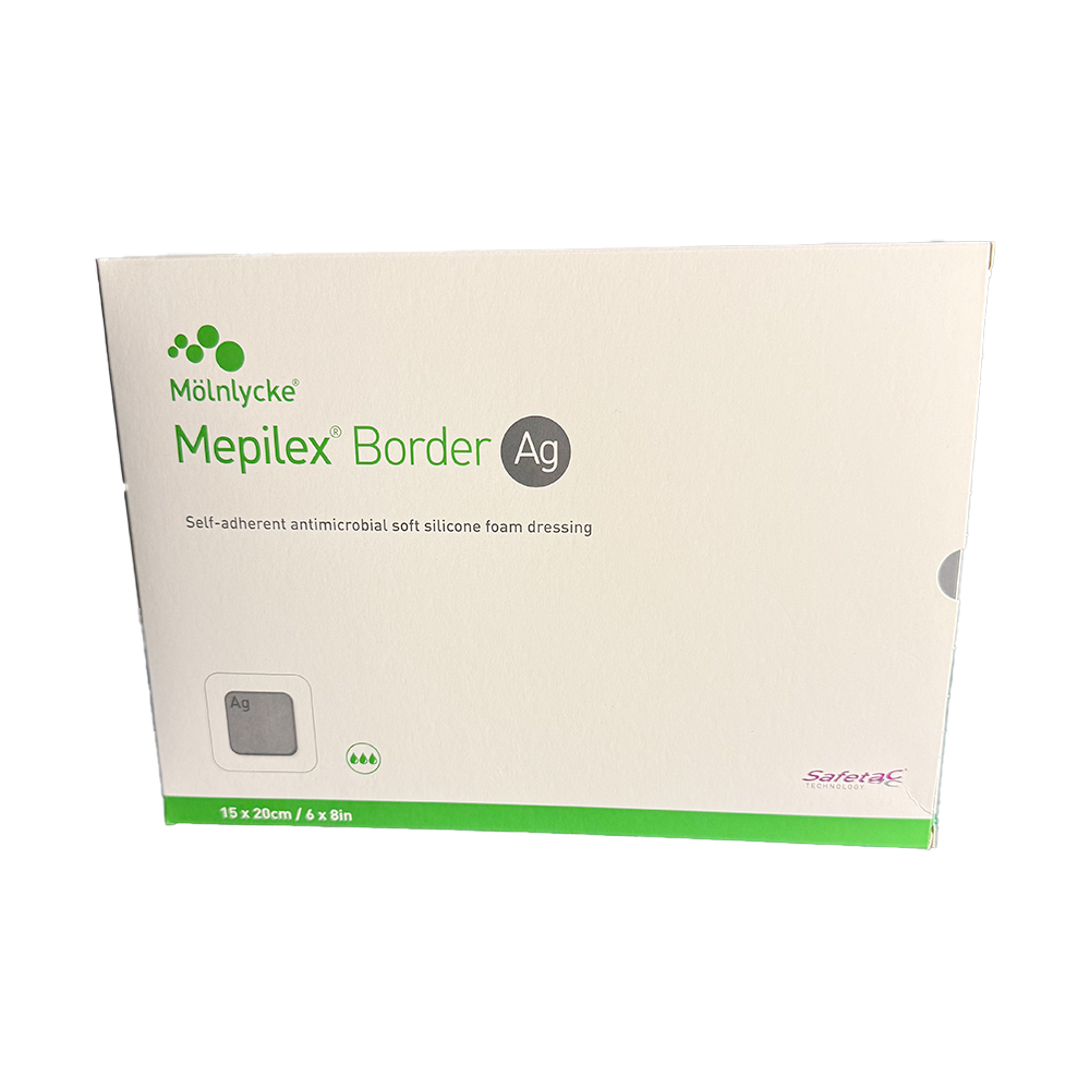 Mepilex Border Ag Foam Dressings provide an all-in-one solution for absorbing and holding onto exudate and creating a moist environment for optimal wound healing. Releasing silver sulphate particles, this antimicrobial foam dressing utilizes Safetac technology to close off the wound’s edges. This action prevents exudate from leaking from the dressing onto the surrounding skin, lowers the risk of irritation and maceration, and reduces damage to the wound and surrounding skin during removal.