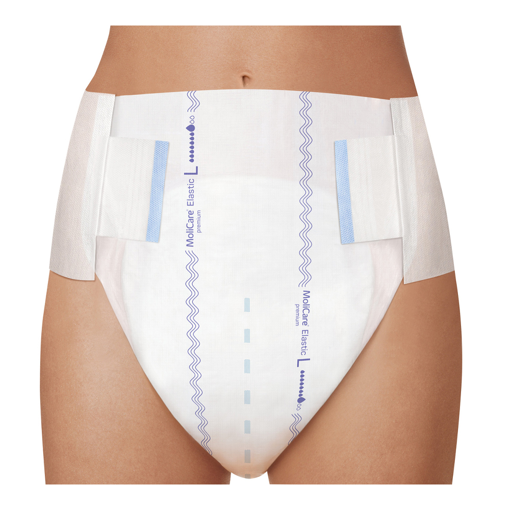 MoliCare® Premium Elastic briefs feature patented side panels with a high degree of flexibility. These are then secured with a single, re-closable hook tab on each side, offering a wider width for a comfortable grip and easy handling.