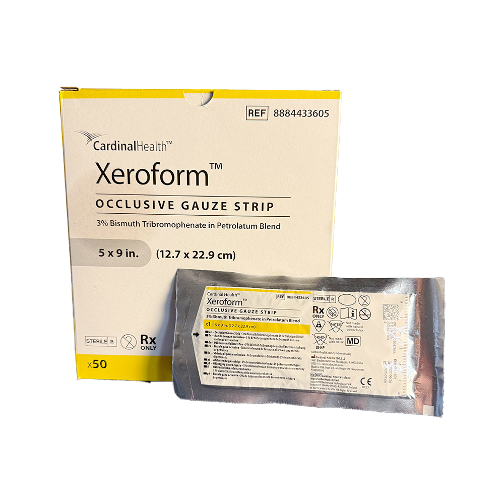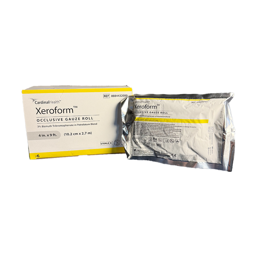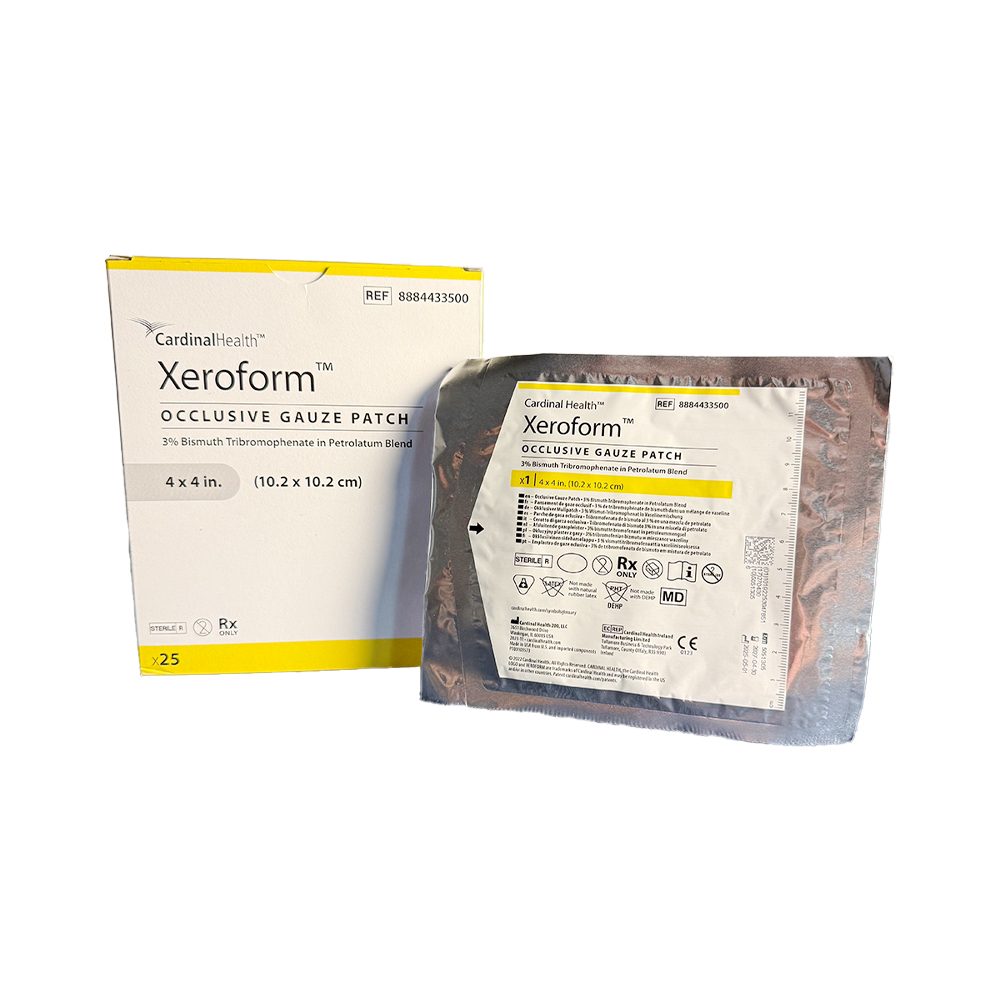 Xeroform Occlusive Petrolatum Gauze is a non-adhesive dressing that encourages healing through 3% Bismuth Tribromophenate, a bacteriostatic/antibiotic compound, delivered in a petrolatum blend.